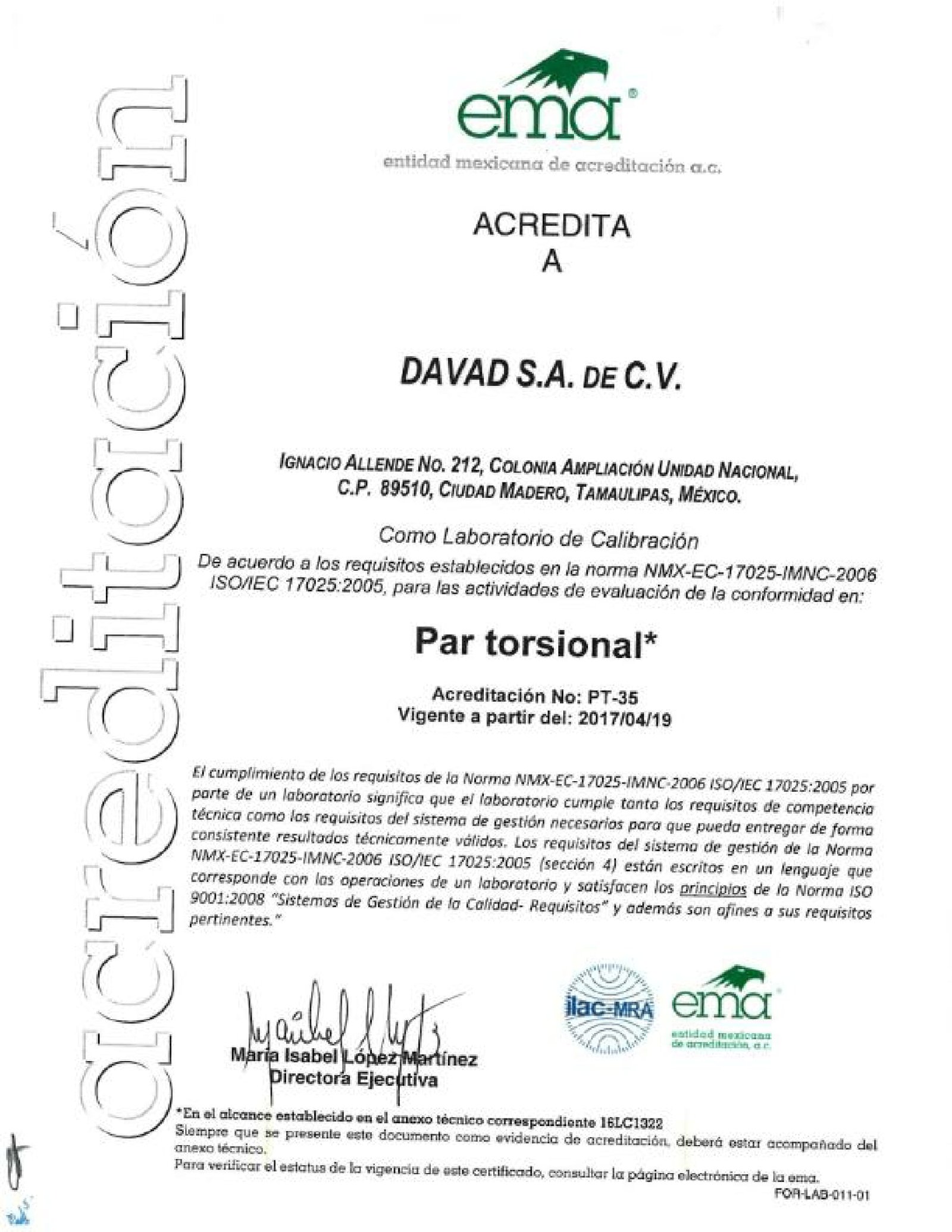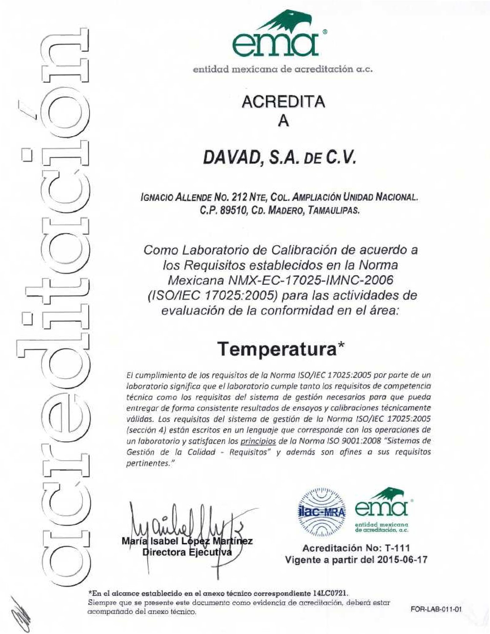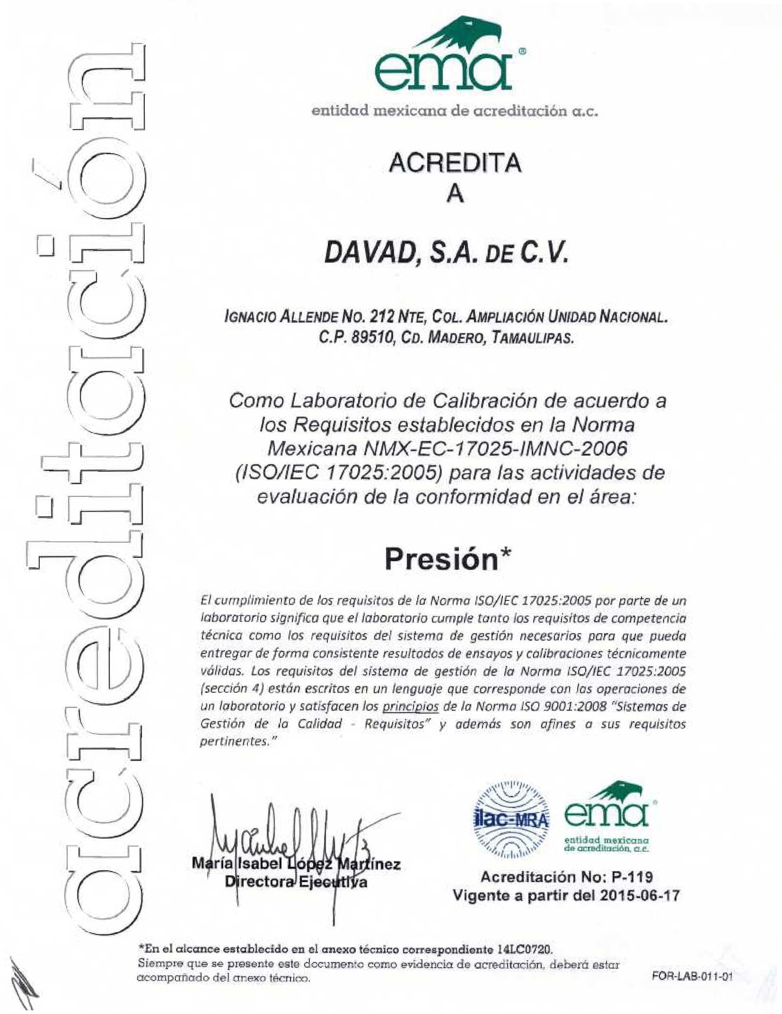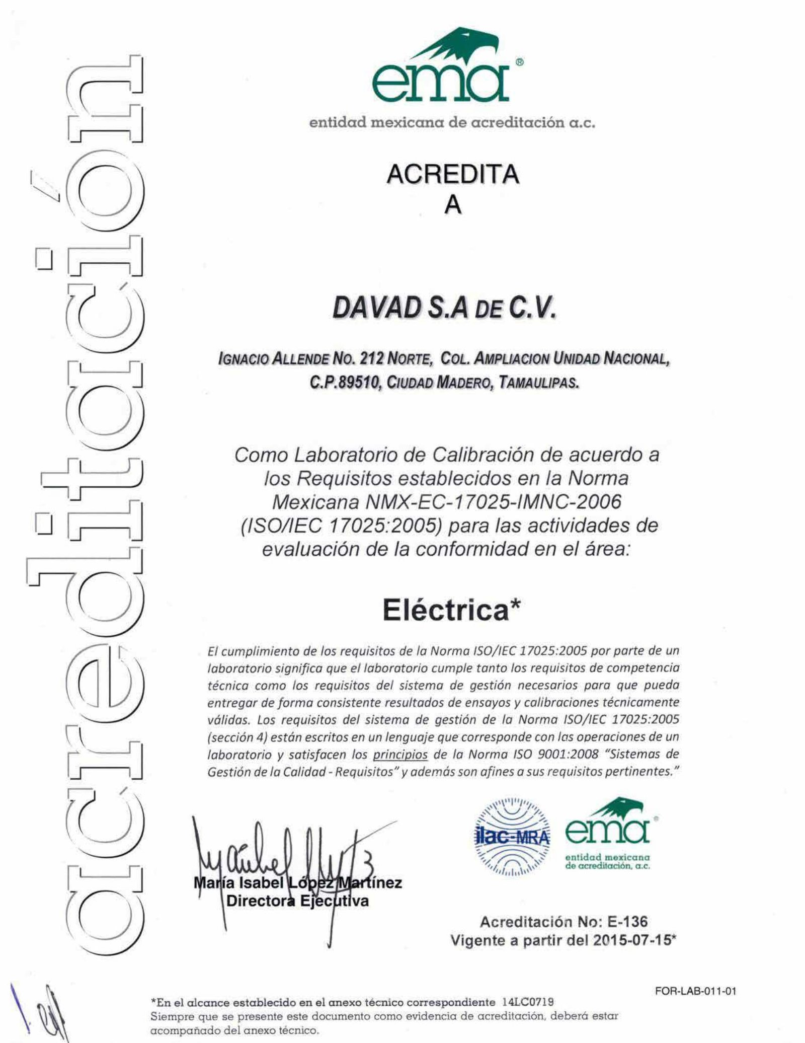 Laboratorio de Metrología DAVAD, instalado y equipado para brindar servicios profesionales de calibración en 4 magnitudes acreditadas ante Entidad Mexicana de Acreditación (EMA), la cual cuenta con el Acuerdo de Reconocimiento Mutuo (MRA) de ILAC (Cooperación Internacional de Acreditación de Laboratorios) y de APLAC (Cooperación de Asia Pacifico para la Acreditación de Laboratorios).